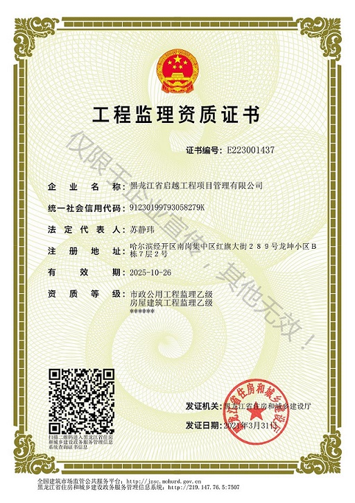 黑龍江省啟越項(xiàng)目咨詢集團(tuán)有限公司,成立于2006年10月17日,具有中華人民共和國(guó)住房和城鄉(xiāng)建設(shè)部頒發(fā)的工程招標(biāo)代理機(jī)構(gòu)甲級(jí)資質(zhì)、工程造價(jià)咨詢企業(yè)甲級(jí)資質(zhì);黑龍江省住房和城鄉(xiāng)建設(shè)廳頒發(fā)的房屋建筑工程監(jiān)理資質(zhì)及市政公用工程監(jiān)理資質(zhì);黑龍江省司法廳頒布的司法鑒定許可證;中國(guó)政府采購網(wǎng)登記注冊(cè)的政府采購代理機(jī)構(gòu)。我公司是專業(yè)從事工程類招標(biāo)代理服務(wù)、政府采購項(xiàng)目類招標(biāo)代理服務(wù)、工程造價(jià)咨詢服務(wù)、工程造價(jià)司法鑒定服務(wù)、工程監(jiān)理服務(wù)及建設(shè)項(xiàng)目全過程跟蹤管理的工程技術(shù)服務(wù)咨詢企業(yè)。